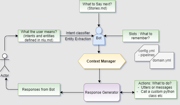 | Actions | Things your bot can do and say. Three kinds of actions : Default actions, utter actions, custom actions |